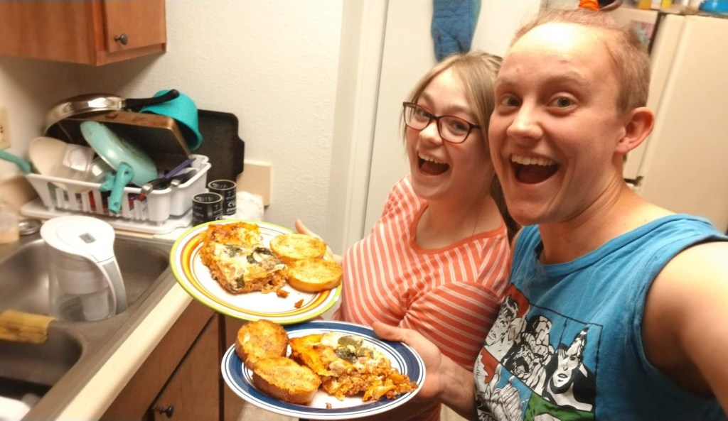Also, look at that gorgeous silhouette on the cover. It was drawn by my cousin, Elizabeth Tilly (she’s an amazing artist), and this is also her first published work! It was so much fun working with her on the story. We’re basically the dynamic duo. You could look at our official author/illustrator pictures, but this is what we look like most of the time. (We had just finished making a lasagna and were very excited to eat it.)